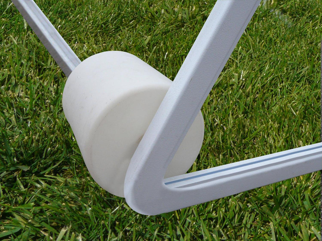 Specially engineered aluminum extrusions feature extra-thick wall construction and generously rounded corners to enhance both durability and player safety. Each goal is finished with a super-thick, bright white textured powder coat and is backed by an industry-leading eight-year limited warranty. The 12-inch-wide molded polyethylene ballast drums roll smoothly—even through wet, muddy, or tall grass—and deliver permanent stability once filled with sand during installation.